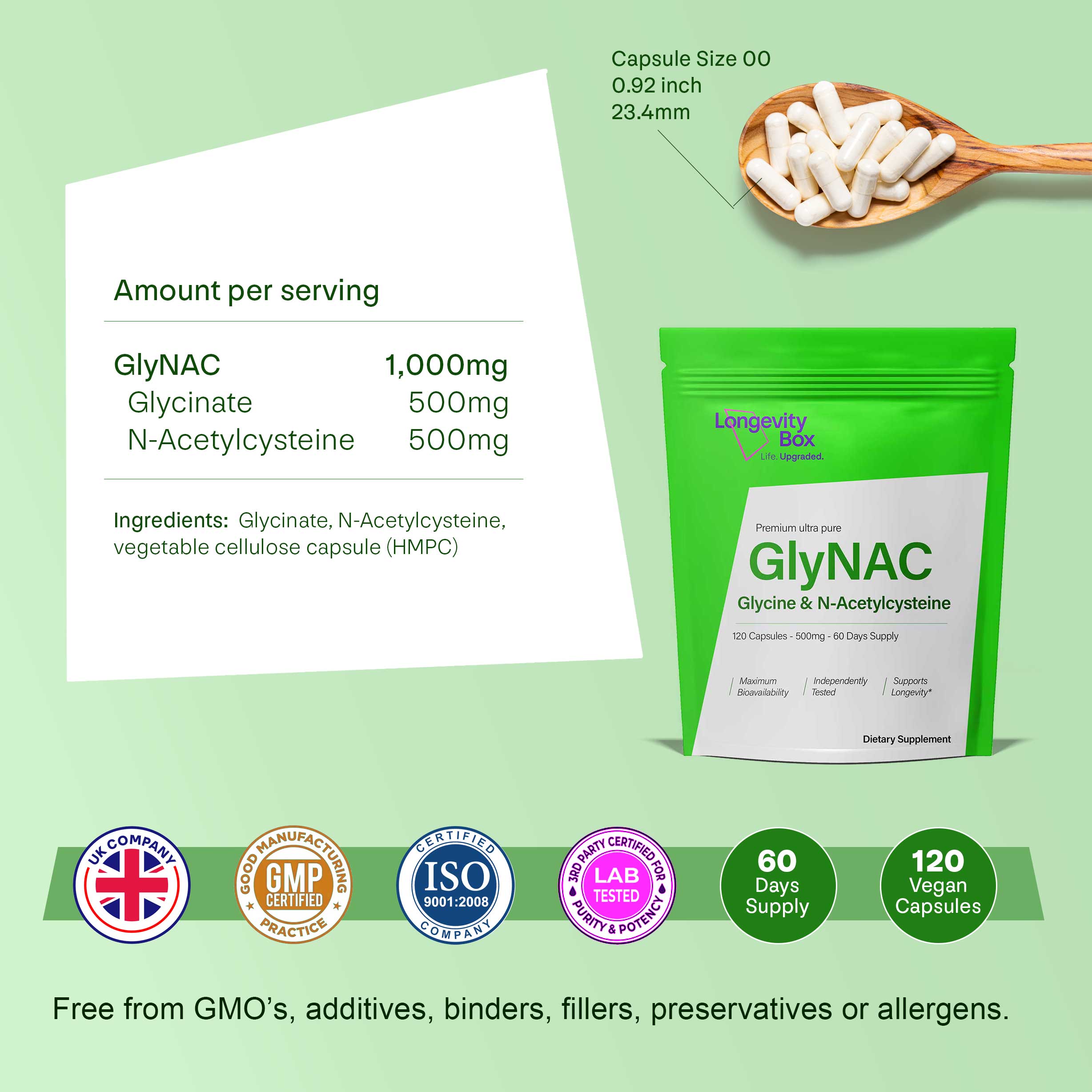 This study involved 24 older adults and 12 younger adults who were given GlyNac supplements or a placebo for between 2 and 16 weeks. The dosage used was 100 mg /kg for both glycine and NAC.. Where Do You Buy GlyNac Supplements? N-acetyl cysteine (NAC). 600 mg. Quality made supplement. While there are sure to be GlyNac capsules sold in stores.