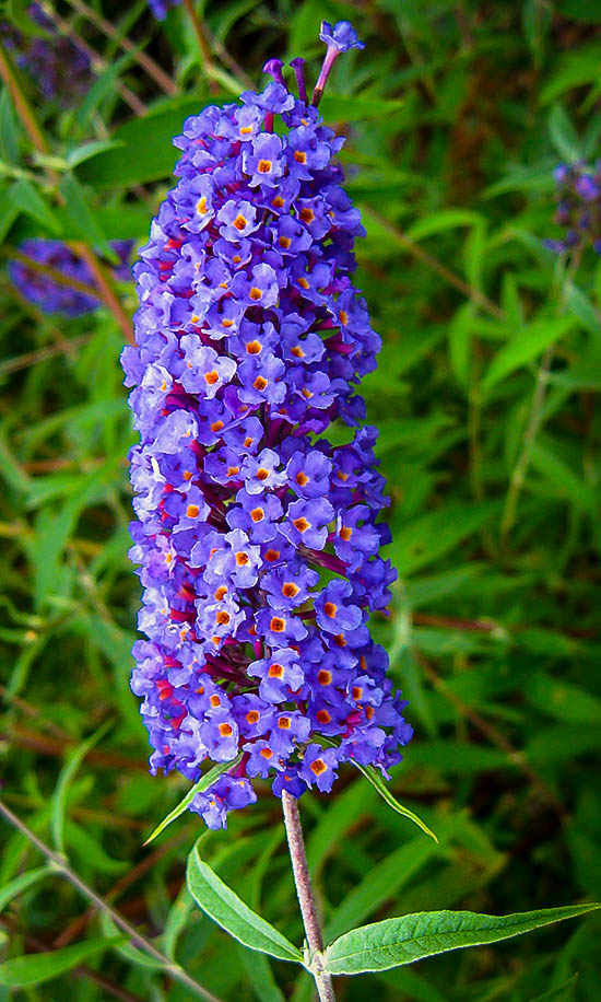 Buddleia davidii v. nanhoensis 'Nanho Blue' (Nanho Blue Butterfly Bush) From the breeding program at the Boskoop Experiment Station in Holland comes a smaller leaved butterfly bush that still reaches 6' tall, contrary to some garden catalogs. The narrow silvery foliage is highlighted with the bluish flowers that are produced all summer.