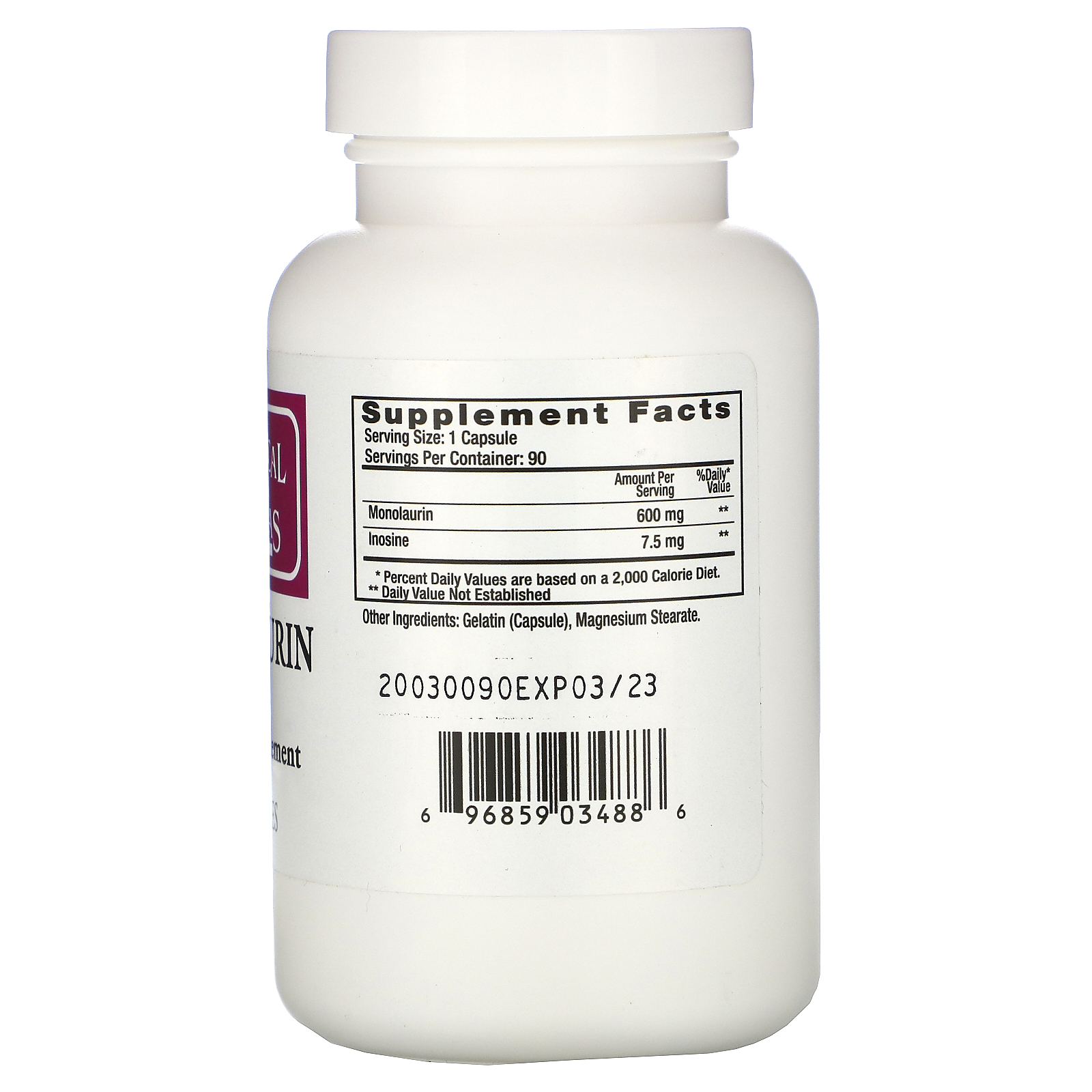 Ecological Formulas Pure Monolaurin 600 mg 90 Capsules (Pack of 2) 3 offers from $82.65. Next page. Important information. Ingredients: Monolaurin,Inosine,Gelatin,Magnesium Stearate. Directions: DIRECTIONS: Take one or two capsules with each meal, or as directed by a physician.
