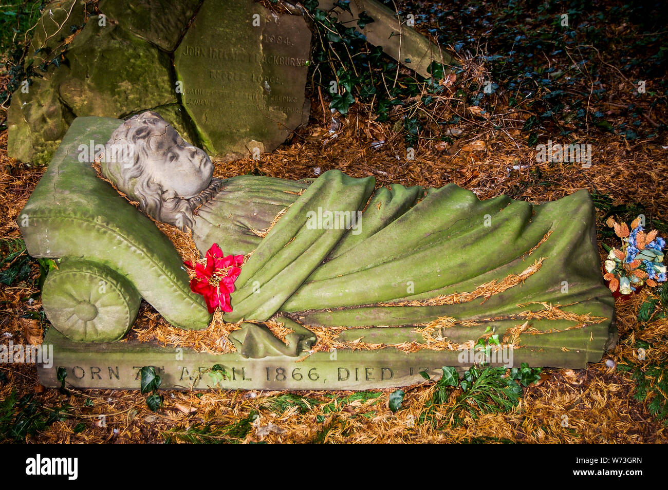 Download this stock image: Warm vibrant image of the gravestone for Mabel Francis Ireland Blackburn, known locally as the 'Chewing Gum Girl'. Died of whooping cough aged 3 years old in 1869. the Victoria effigy depcits a young child in a night shirt with her head propped up on a pillow. This grave is located at Overleigh Cemetery in Chester.